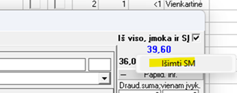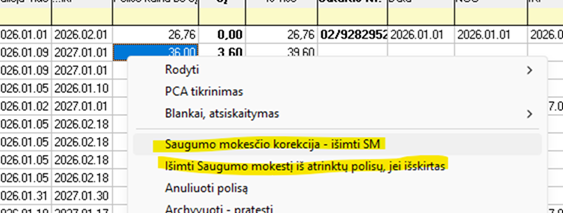 Tai pat galima pakeisti saugumo mokestį (išimti/išskirti) ir pačiame polise – viršuje dešinėje paspaudus ant sumų dešinį pelės klavišą: