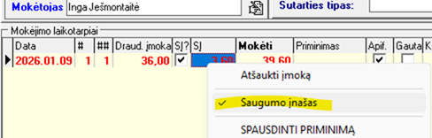 Paspaudus dešinį pelės klavišą ant suplanuotos įmokos galima nuimti/uždėti saugumo mokestį konkrečiai įmokai: